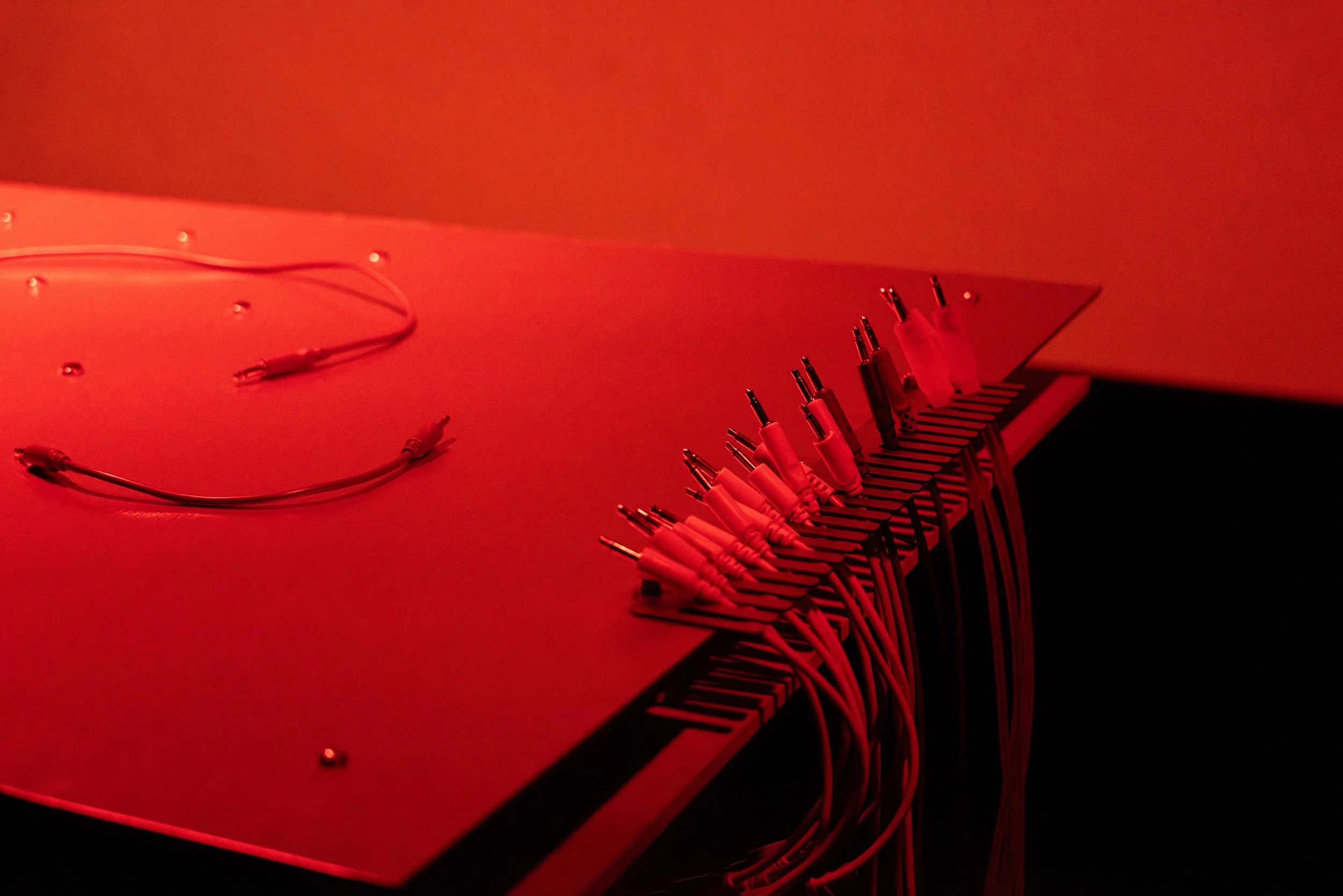 Dama’s most recent work, Signal Distance (2025) was developed in collaboration with Quentin Bolsée from MIT’s Center for Bits and Atoms. The piece consists of a custom synthesizer board that produces sound based on the physical length of the patching cables, along with a projected visual output that shifts based on sound in the room. Participants were invited to move cables in and out of slots, changing the tones. These changes in tone, in turn, modulated the target-patterned visual output, whose red and black radar-like lines illuminated the room.
